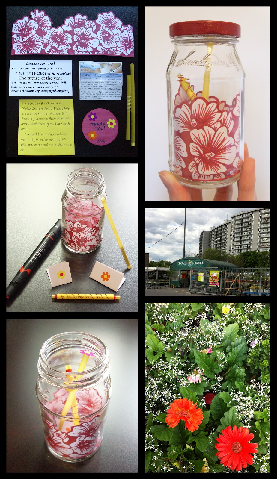 This Art House Co-op mini project was called "The Mystery Project". Earlier in the 10 x 10 series, they had "The Jar Project", which I thought was a really neat idea, but unfortunately I didn't get to participate at the time. I used the same idea for this project instead. I was sent a theme card and a crimson red Prismacolor marker. I had been gardening and thought that seeds growing year after year into beautiful flowers were a good match for "The Future of the Year" theme. I placed the seeds in a straw, wrote up the information about the project and arranged everything in the jar, then hid it at a local flower market for someone to find.